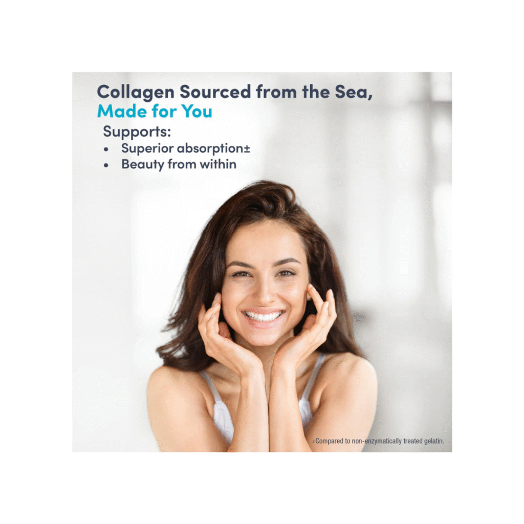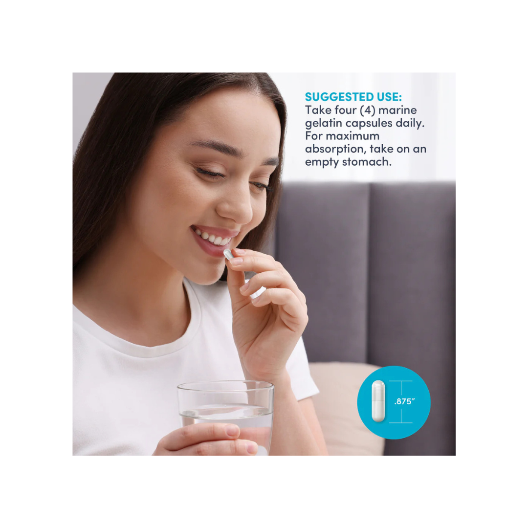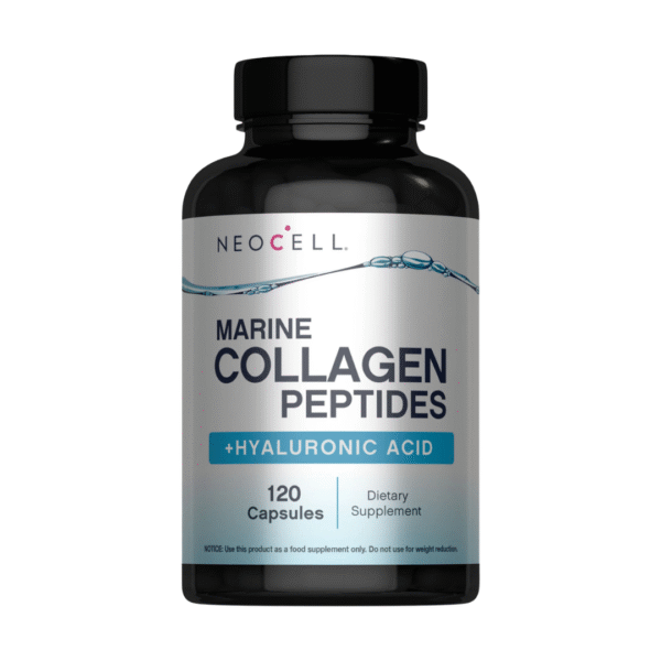 Le Marine Collagen Peptides + Hyaluronic Acid associe collagène marin hydrolysé et acide hyaluronique pour soutenir l’élasticité et l’hydratation de la peau. Sa formule contribue également à renforcer les cheveux et les ongles tout en favorisant le confort articulaire. Présenté en 120 gélules de gélatine de poisson, il s’intègre facilement à votre routine quotidienne de bien-être.