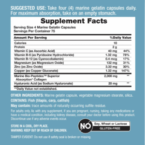 Le Marine Collagen Peptides en poudre associe collagène marin hydrolysé, acide hyaluronique, MSM et vitamine C pour soutenir l’élasticité et l’hydratation de la peau. Cette formule complète contribue également à la solidité des cheveux et des ongles ainsi qu’au confort articulaire. Format 200 g facile à mélanger dans vos boissons pour une routine beauté et bien-être quotidienne.